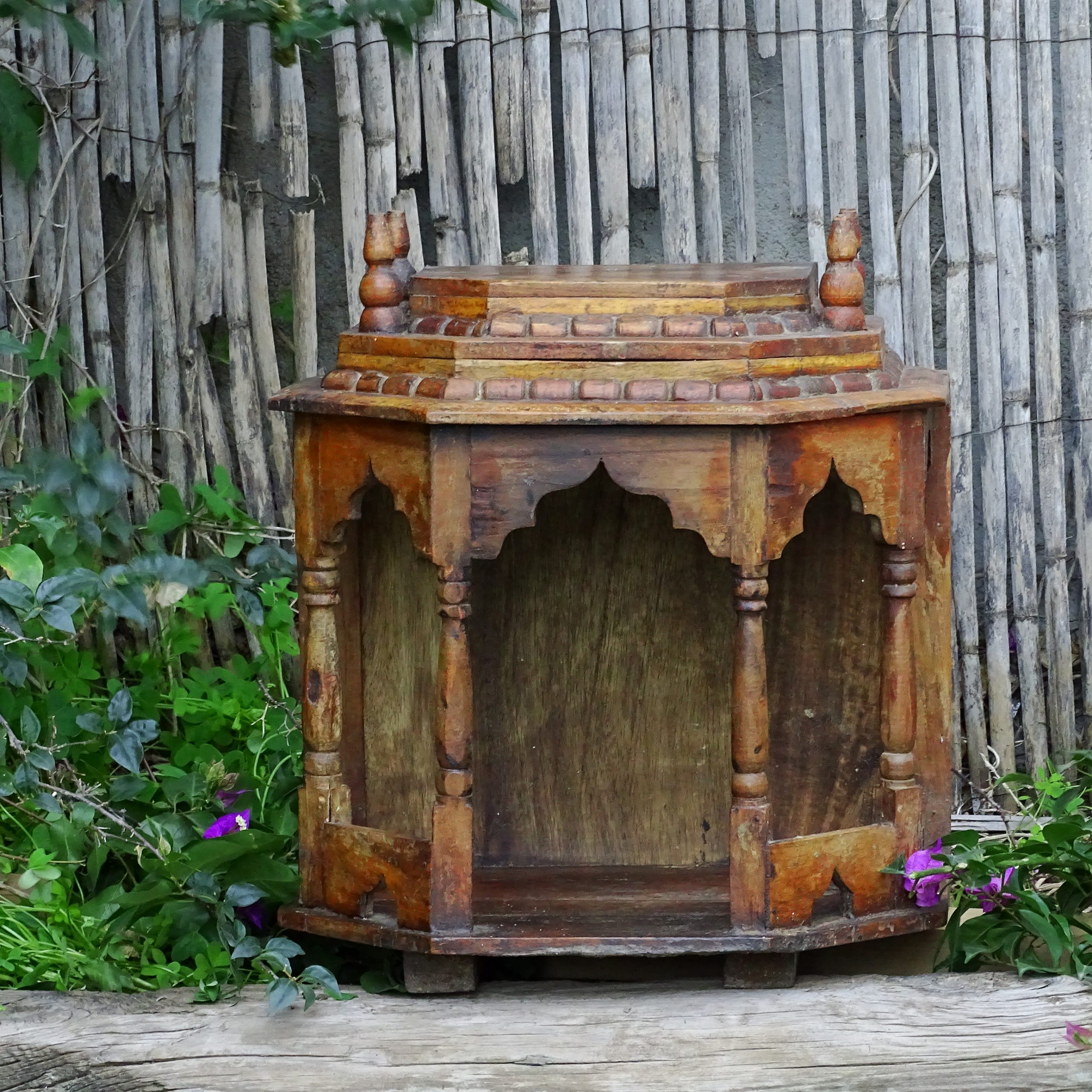 The ancient wooden altar, with simple lines and soft finishes, holds the warmth of time. Its surface, slightly weathered, reflects the mark of the years, while delicate carvings along its edges whisper past stories.       38x25x44cm.