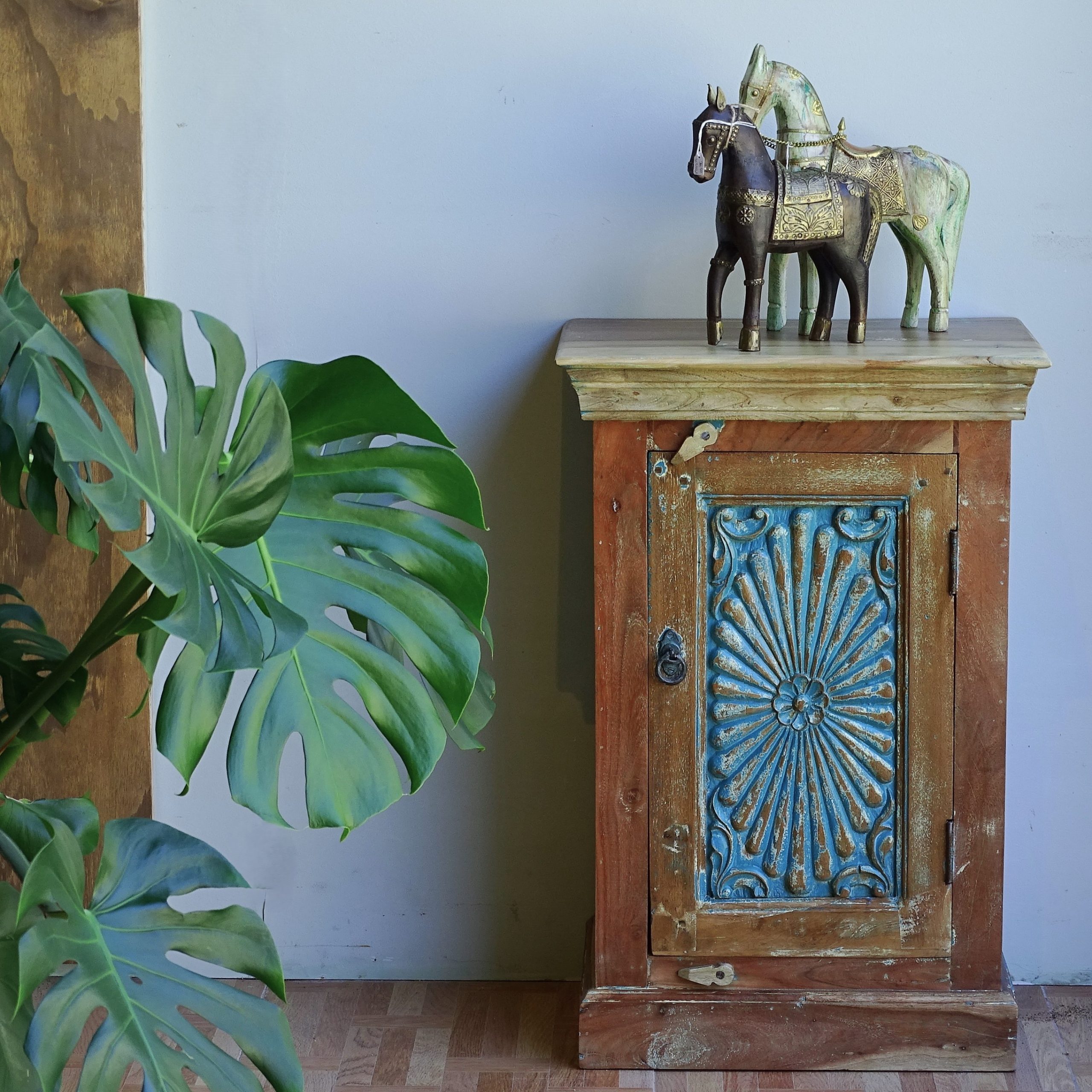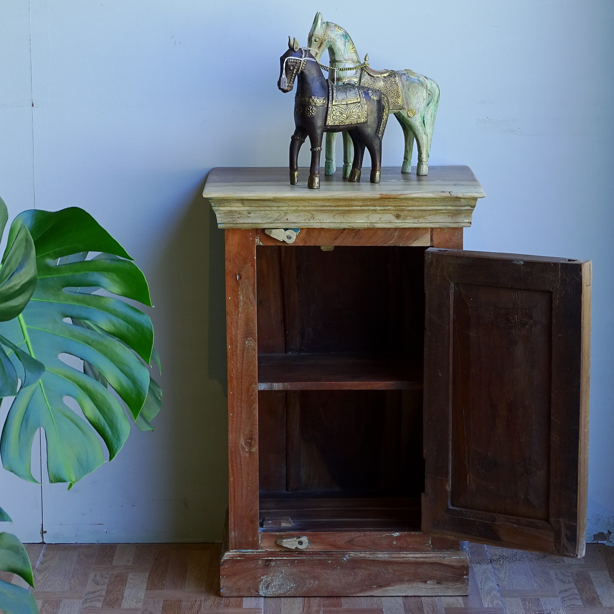 This bedside table, crafted from recycled wood, features a unique design provided by the panel of an old main door.