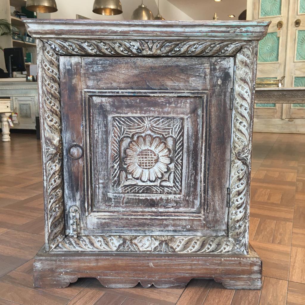 This bedside table, crafted from recycled wood, features a unique design provided by the panel and frame of an old window.