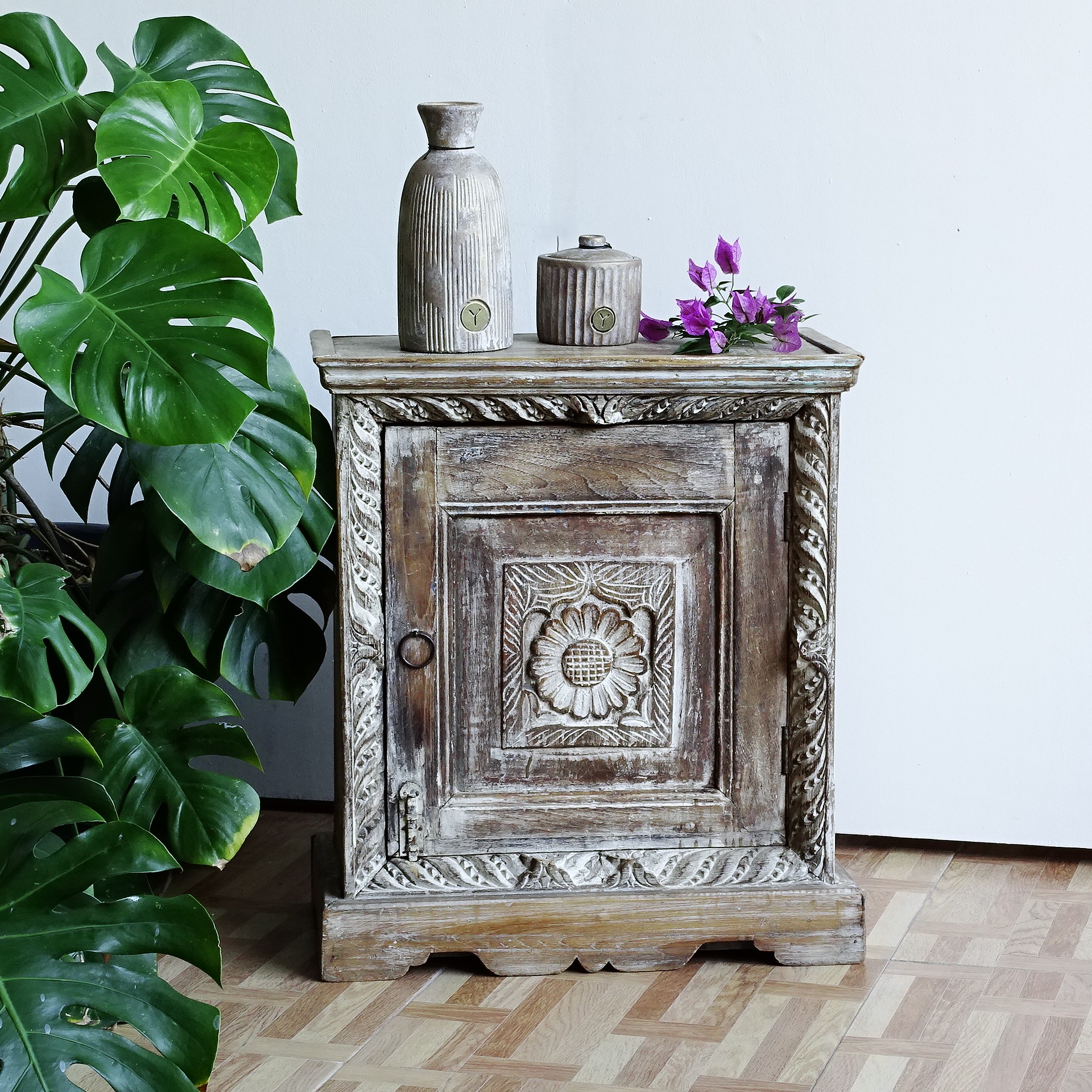 Bedisde wit carved door