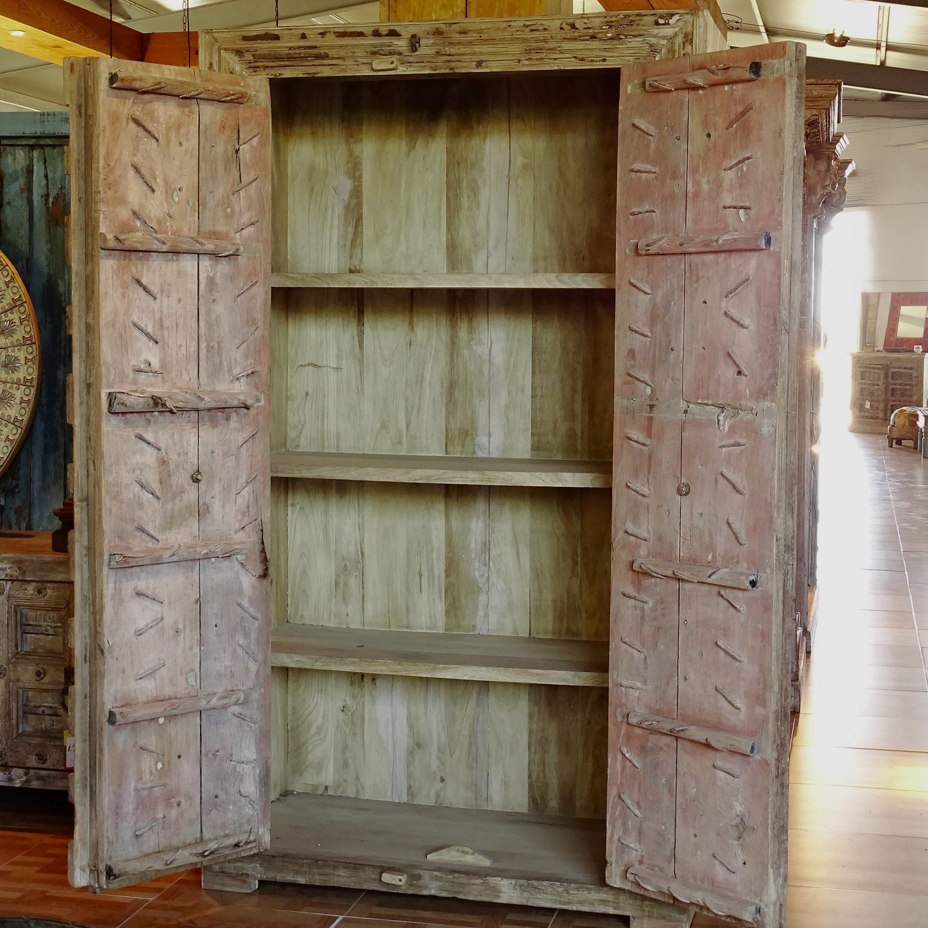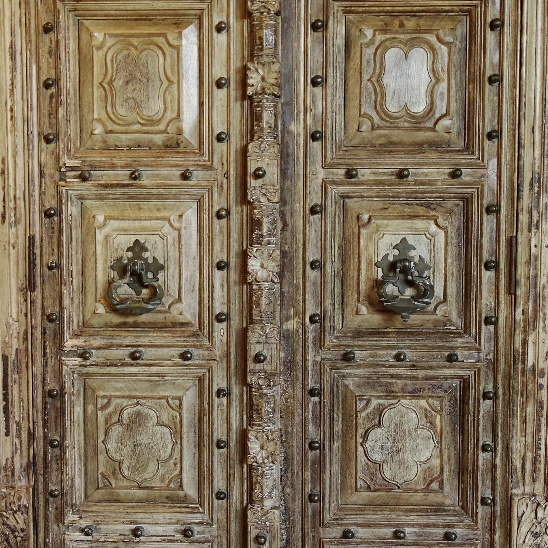 Wooden cupboard with antique doors and bronze decoration. 113 x 52 x 194 cm.