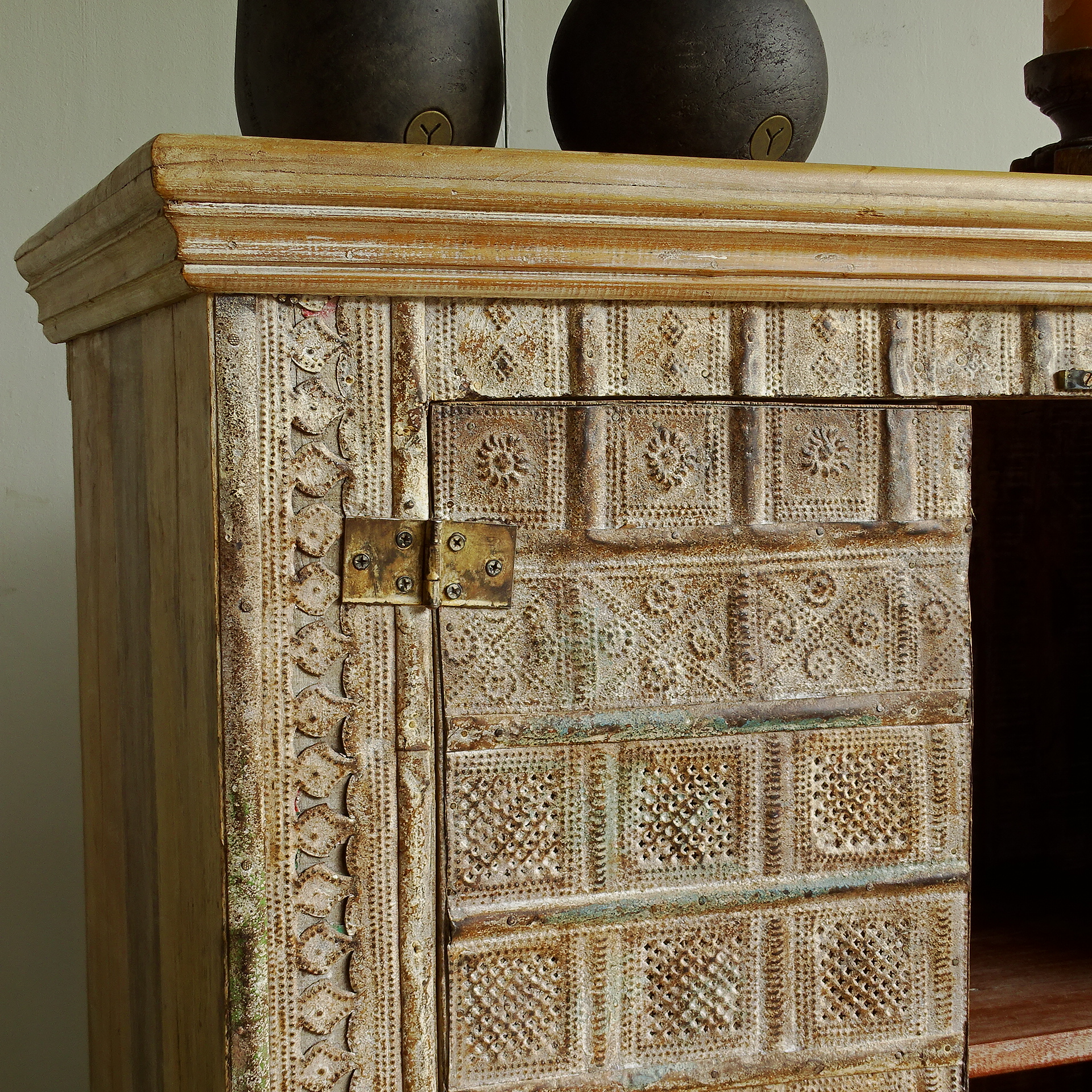Wooden cupboard with iron panel decoration.