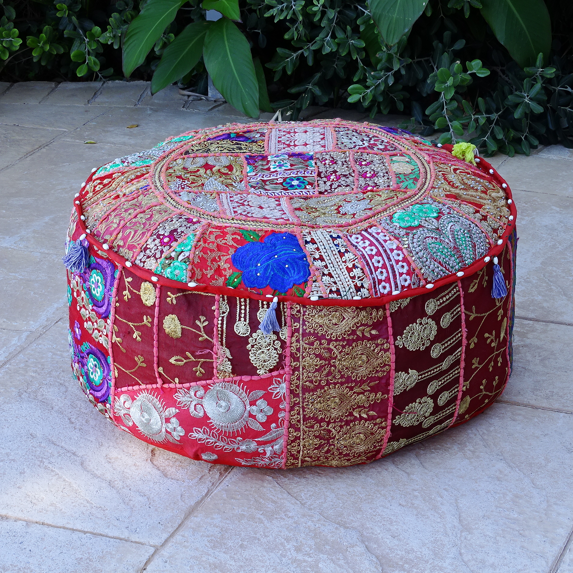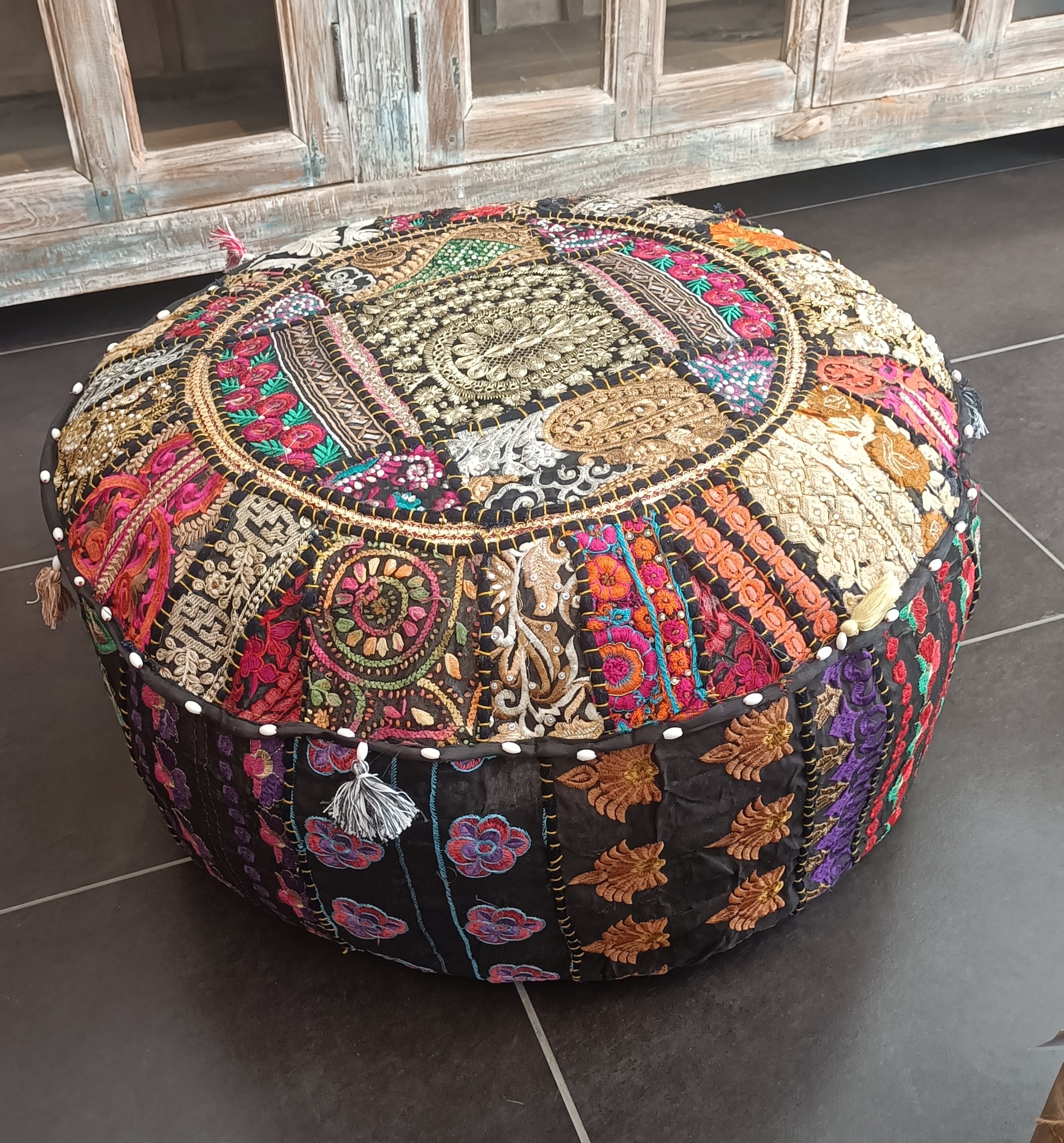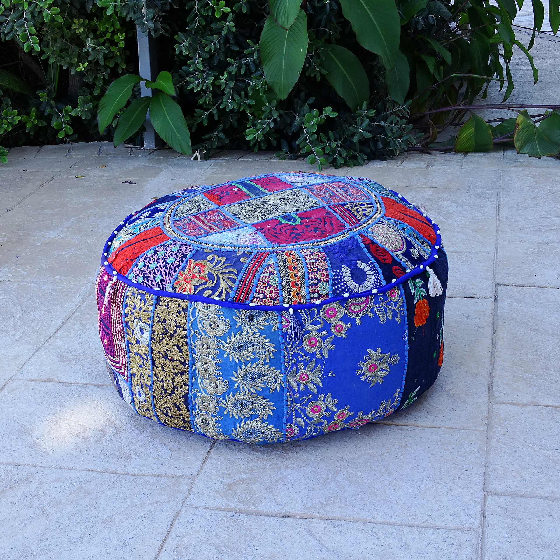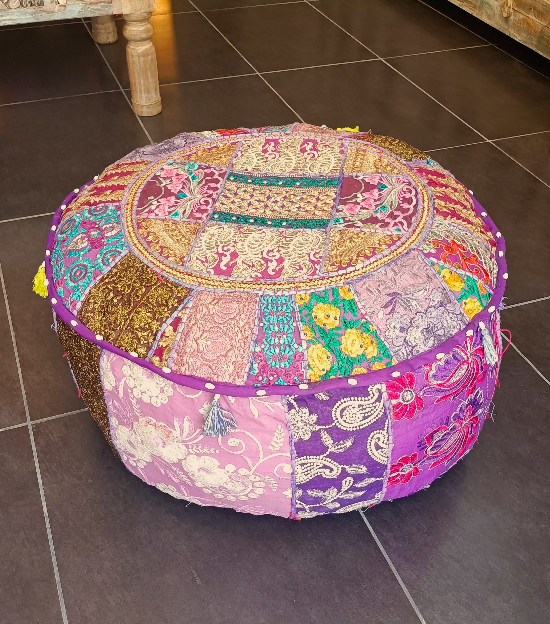 Embroidered cotton puff in different colors. 63cm x 63cm x 32cm.