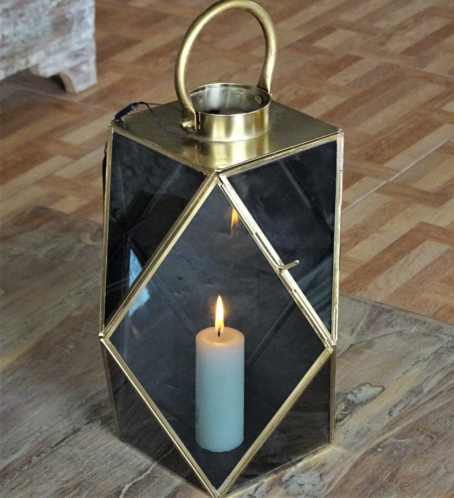 Dark Glass gold metal lantern.