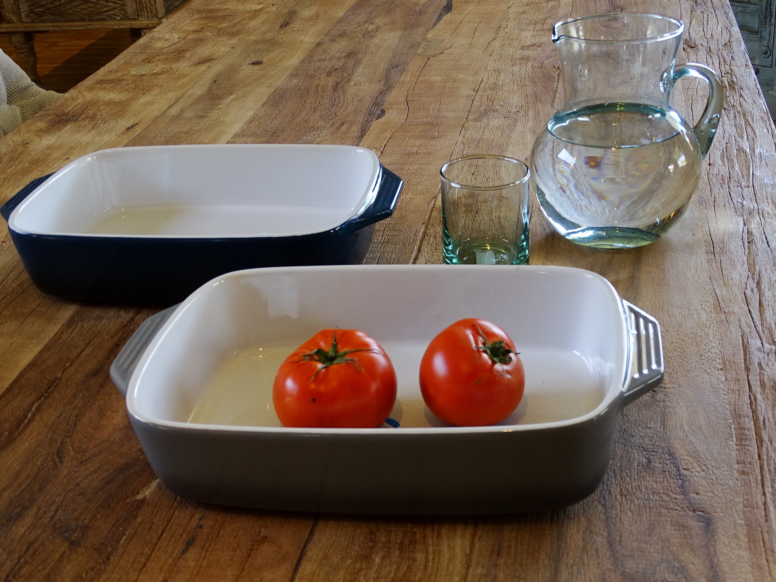 Ceramic oven tray in two colors : grey or blue, price by unit . 39 x 24 x 9 cm.