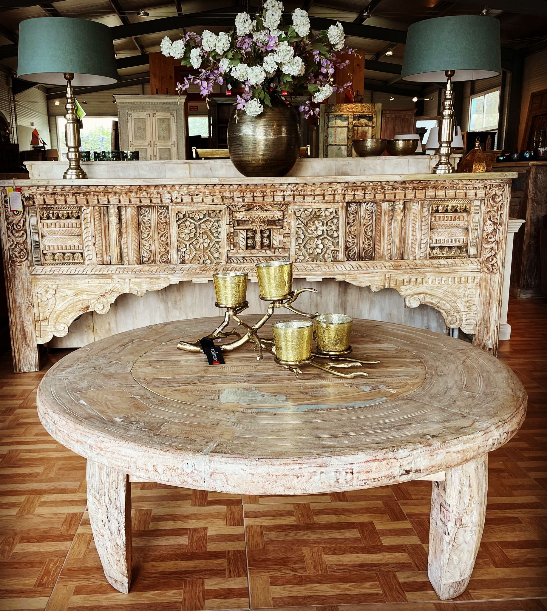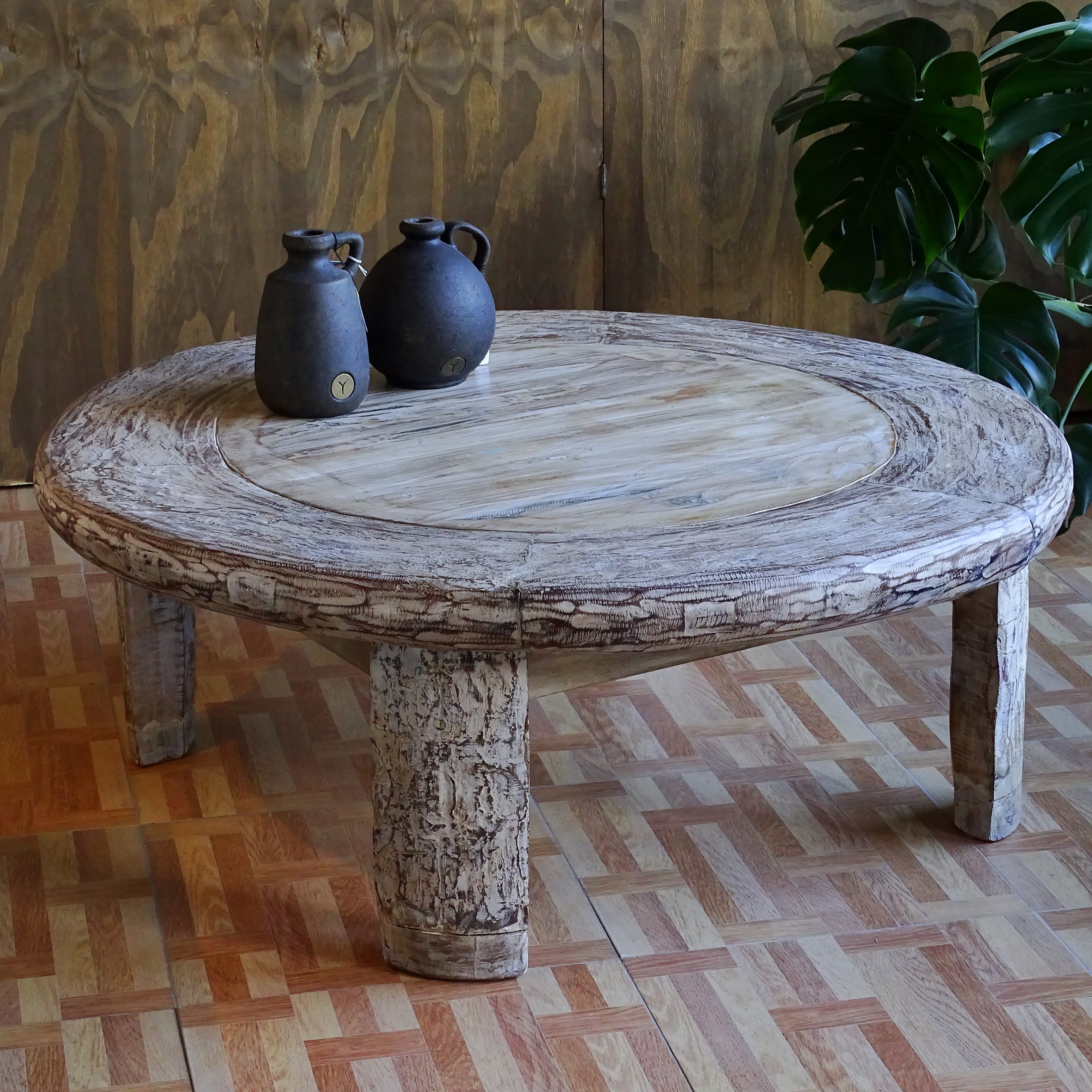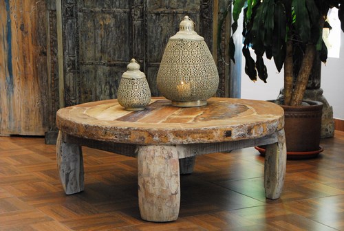 This table is made from the wheel of a Hindu camel cart.
